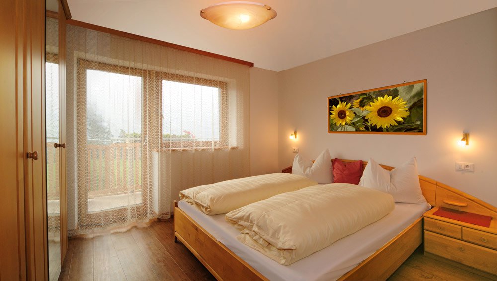 Grazie ai suoi 55m² quest’appartamento offre tutto lo spazio necessario per ore rilassanti e tranquille. La moderna cucina abitabile e il divano letto v’inviteranno ad accomodarvi per trascorrere momenti piacevoli; le due camere separate vi garantiranno tutta l’intimità che potete desiderare. Le vostre notti saranno sicuramente rigeneranti che dormiate nel nostro letto matrimoniale o nel nostro letto alla francese. Il grande balcone è il luogo ideale per fare colazione all’aperto e i numerosi armadi a muro offrono molto spazio utile per riporre oggetti. L’ampio bagno con doccia, wc, asciugacapelli e specchio cosmetico, sarà la vostra oasi di benessere privata. La tipica costruzione di legno emana un calore naturale che dona all’ambiente una sensazione di benessere. Seduti sulla panca ad angolo di legno di castagno locale, potrete godere del sole immersi nel verde, pur rimanendo seduti nel vostro appartamento vacanze. L’ampia vetrata vi regalerà la visione di un panorama mozzafiato sulla favolosa natura dell’Alto Adige.